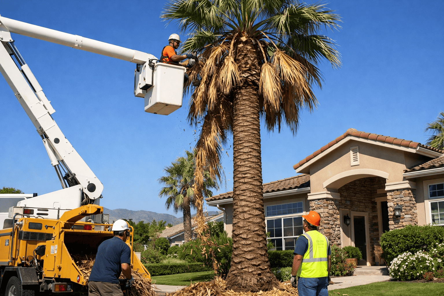 Yes. Palm tree trimming is one of our most requested services in San Diego County. We remove dead fronds, old flower stalks, and seed pods cleanly and safely. Furthermore, we do not over-trim palms — removing green fronds stresses the tree and is a common mistake made by inexperienced crews.