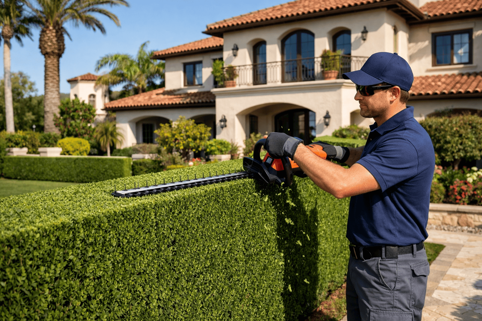 Formal hedges Italian cypress, ficus, photinia, and other hedge species are trimmed to precise, flat planes or topiary shapes with battery-powered hedge trimmers and hand pruners for fine detail.